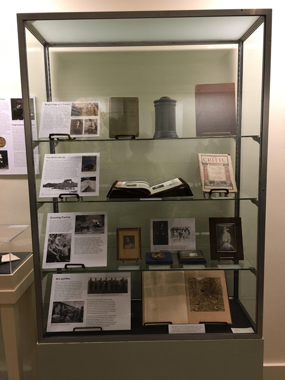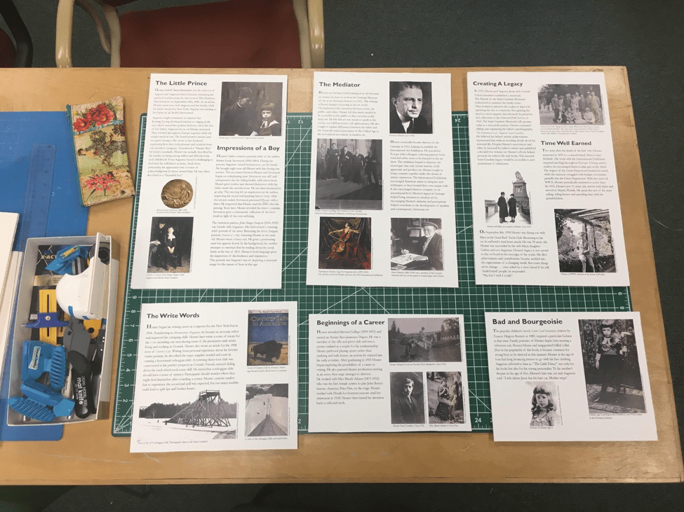 OUR HOMER EXHIBIT WAS A HUGE SUCCESS! Towards the end we were worried that we were not going to finish in time but we did. Through hard work and dedication Abigail, Elizabeth, and I were able to finish the exhibit. Our research from Rauner paved the way to create an indepth story of Homer Saint-Gaudens that will give the audience a view and glimpse into his life. Countless time was spent on editing to make sure that the information was both correct and in chronological order. Once done, Elizabeth and Henry reviewed our work and made sure that it was correct. Afterwards we printed it out and mounted it on foam core. We then went on to gather the objects for the exhibit and made tombstone labels that give all the necessary information about the objects. Once everything was done we gathered boxes that we would use to transport the items to be set up on friday which is opening day.