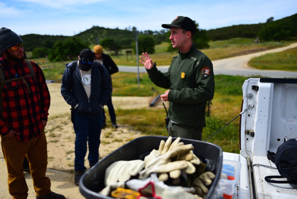 During the week of April 24th, 2017 the team was working in Jawbone Canyon on the west side of Pinnacles National Park. A new trail has been slated to go through the canyon and through a section of Italian thistle, an invasive species. It is crucial for the invasive plants to be removed from the trails, as “the seeds will attach to hikers boots and pant legs and spread to other areas of the park,” Mike Shelley explained during his introduction to invasive species removal with a local Native American tribe.